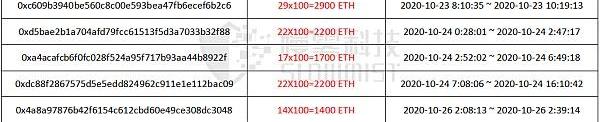 經過核對,發現從Tornado.Cash提款到表3中六個地址的數額竟與黑客存款數額11,500ETH一致,這似乎驗證了我們的猜想。對其他地址的分析方法同理。
