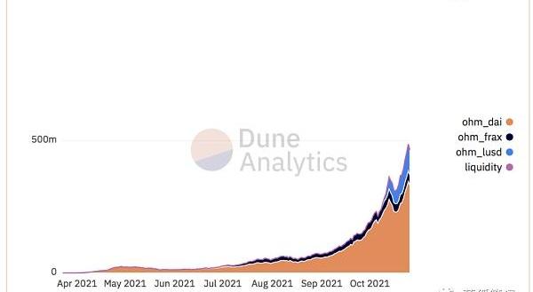 OlympusDAO向參與者發行折扣價格的OHM代幣,獲得流動性提供者的LP代幣頭寸,從而捕獲了“流動性”。OlympusDAO的財庫掌握了流動性,雖然其OHM在增加,但隨著其債券銷售越多,其掌握的流動性也越大。截止到目前,OlympusDAO擁有超過4.6億美元的流動性。