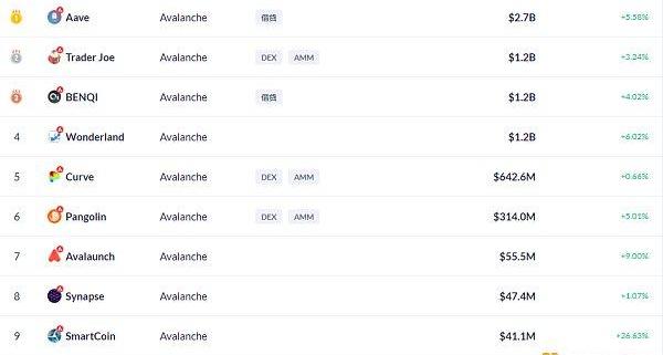 Avalanche鏈上DeFi鎖定資產前十排名及鎖倉量,數據來源:Debank
