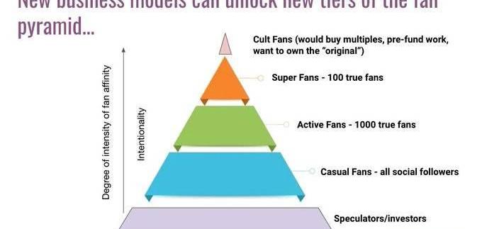 15、我在下面這篇昔日推文中,我將NFT和社交代幣描述成「粉絲金字塔」:使創作者能夠從死忠粉絲以及新的投機者/投資者手中賺錢。