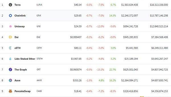 DeFi項目鎖定資產前十排名及鎖倉量,數據來源:Debank