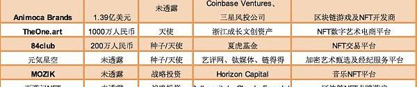 從中國NFT相關投融資情況看,國內發生了7起融資事件,其中,香港移動游戲開發公司AnimocaBrands獲得了1.39億美元的融資金額,遙遙領先其他單比融資。此外,NFT數字藝術電商平臺TheOne.art和NFT交易平臺84club也分別獲得了1000萬和200萬人民幣的投資。其余四起未透露具體融資數額。