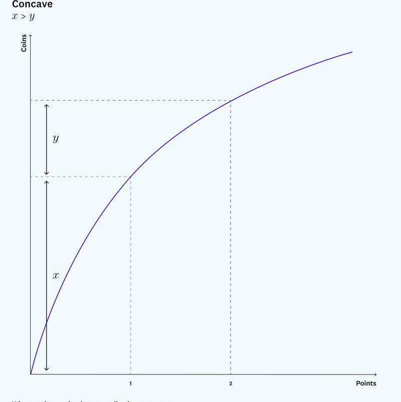 相反的方法是凹函數,從0點到1比從1到2更有價值。這種是吸引新用戶的理想方法,因為它獎勵最初的貢獻比之后的貢獻更多。但如果用戶是匿名的,這樣的曲線很難維持,因為在這種情況下,用戶可以創建許多賬戶,并在每個賬戶上獲得“早期”積分。