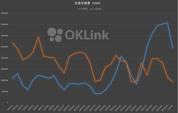 比特幣全網的未確認交易筆數在上周一度超過12萬筆。加之全網算力的持續回落,鏈上手續費延續前周的上行趨勢,單日手續費在十月最后兩天均超過350萬美元,這是比特幣自18年1月24以來的新高。