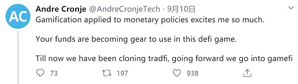 但不得不說鏈下現實資產的映射需要考慮的因素涉及方方面面,絕非一朝一夕之功,因而接下來最有可能快速打開局面的路徑就是直接依靠鏈上原生資產,就像YFI創始人Ander Cronje在9月10日公開提出的“GameFi”,與DeFi、加密游戲等熱門領域產生碰撞融合,可能會是NFT下一個主要的創新方向。