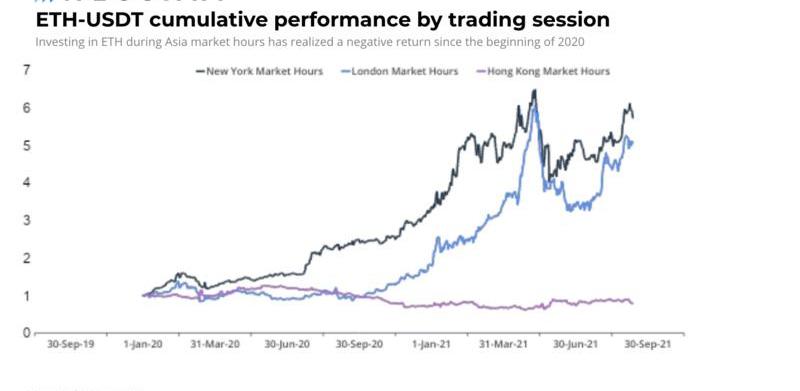 如果投資者自2020年初以來一直持有?ETH,他們的初始投資將增加26倍以上。然而,如果同一位投資者只在香港市場交易時段持有ETH,他們反而會實現負回報。相反,如果他們在紐約或倫敦市場交易時段持有ETH,他們仍然會獲得很大比例的回報。