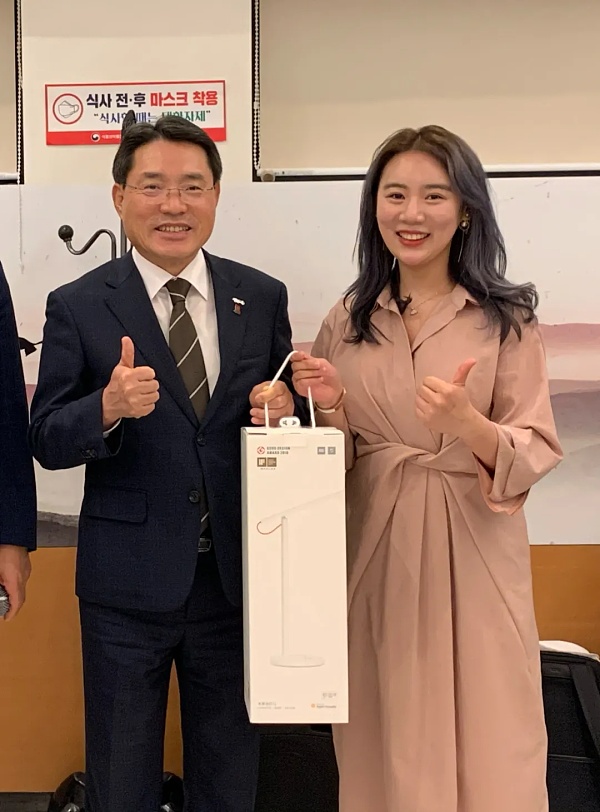 [圖為CyberVein聯合發起人兼韓國區負責人Grace為麗水市市長送上金山云與cvt聯合開發的智慧家居產品]