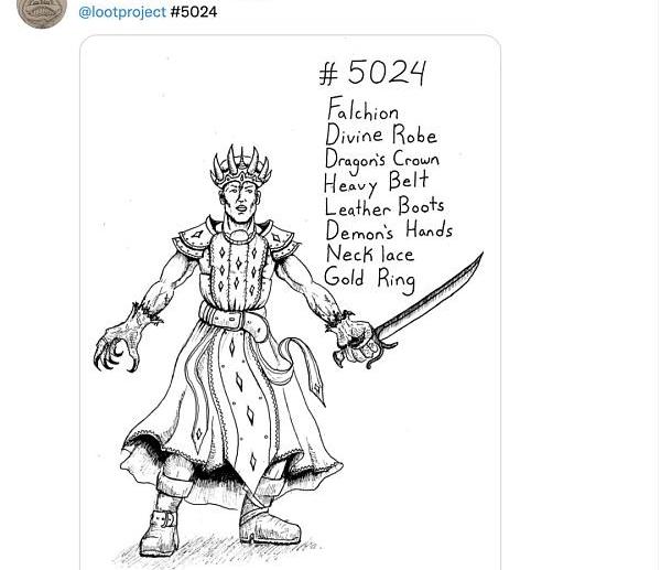 通俗一點,Loot是一種黑色背景,只包含文本的鏈上NFT,任何人都可以參與鑄造,將會隨機獲得一組奇幻冒險家裝備,當然是以文本的形式,這些裝備具有隨機分布的稀缺特征。