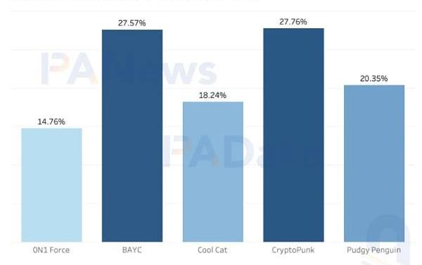 其中BoredApeYachtClub的當前獨立地址數最多,約為5367個,占比也最高,約為53.67%,也即其有效用戶可能最多。其次,當前獨立地址超過4500個的還有Hashmasks、Meebits和PudgyPenguins,其獨立地址占比分別約為30%、26%和51%。