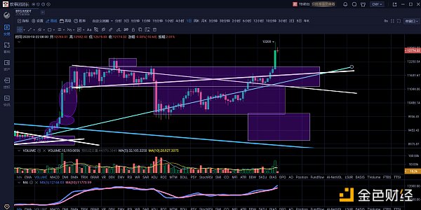 經歷了近三周的上漲,周K線上目前已經運行到沙僧位處。K線西游戰法對沙僧位K線的解釋是沙僧位類似人生,更多的震蕩將在沙僧位K線上發生。因此當前短線快速沖破日線箱體走出新高后的比特幣,個人更多的是看能夠出現周線級別的調整。因此如果在最近幾個交易日中比特幣不能走出新高,那么圍繞12000-12700美金區間的空頭回補勢必要從此展開。