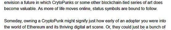 有趣的是,免費的也沒有人領,上線后兩周只有小幾百個被領走。?Larva?Labs去找Mashable博主寫了一篇推廣軟文,才成功把剩下的全部發放完畢。?而這9000個一共也就發給了幾百個人,最多的一個人認領了上千個,認領了超過300個的人也有好幾個。?當時幣圈的大多數人都看不懂?Cryptopunk的價值,一個隨時能復制粘貼下載的頭像為啥還需要認領/購買。?但正如軟文博主最后說的一樣,"也許有一天,擁有一個Punk是一種身份的象征,一張證明你是幣圈OG投資者的憑證,也有可能僅僅是一張普通的圖片"。?