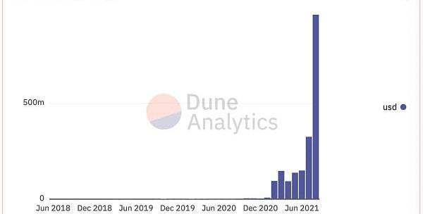 據DuneAnalytics數據顯示,8月前半個月,作為主要的一個NFT交易市場OpenSea,累計交易量達逾8.8億美元,是7月總交易量的2.7倍,按月度交易量來看創歷史新高,日交易量達到超6200萬美元。另外,本月OpenSea上共計銷售62.4萬件NFT,產生的費用超過6000萬美元,活躍的交易者突破10萬人。