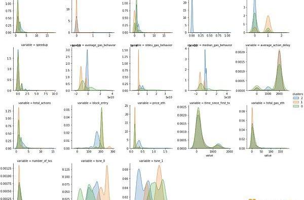 在查看了每個變量的子分布和一些數據示例后,我能夠對集群進行分類。Orange集群是速度最快的組,同時平均提交的gas交易也略低。Blue和Green集群彼此表現出相似的行為,但Blue中的地址通常比Green集群中的地址具有更少的歷史記錄。