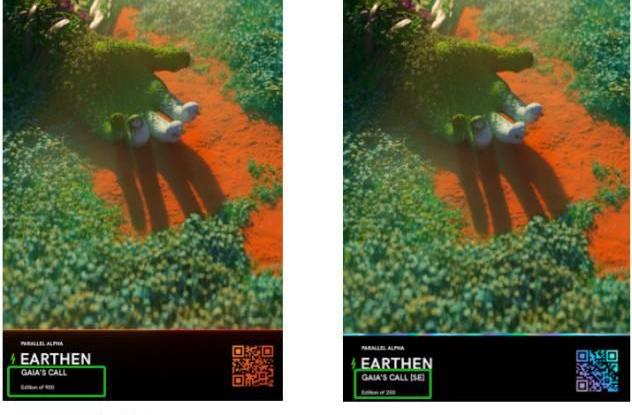 Parallel中另一特殊非實用功能卡為Masterpiece,該卡不帶二維碼,發行版次僅有1張,持有該卡可以獲得對應類型卡片在二級市場轉售時1%的版權費,并按季度發放。該卡獲取途徑為預售、二級市場購買或者補充包購買。