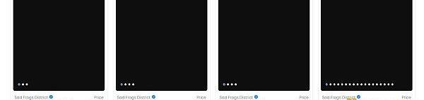 悲傷蛙因為以風靡社交網絡的悲傷蛙Pepe為基礎進行再創作,短時間內在raitytools的7日價值榜單飆升。雖然同樣采取盲盒形式,但是悲傷蛙的開發團隊并沒有像上述兩個團隊一樣出現數據失誤。而問題出在了設計團隊,因為涉嫌抄襲,悲傷蛙NFT被原作者警告并投遞律師函,OpenSea在同一時間下架了所有SadFrogsDistrictNFT的商品。