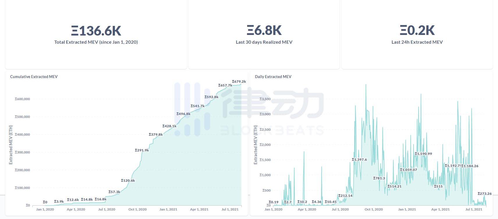 根據MEV-Explore數據顯示,從2020年1月至今,礦工在他們挖取的區塊通過區塊重組、交易重新排序等多種方式額外獲利13.66萬枚ETH,過去30天MEV價值6,800枚ETH。