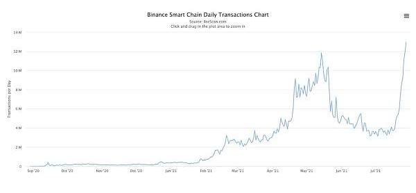 BSCScan數據顯示,7月30日,BSC全鏈的交易次數已達近1400萬次,創下自5月14日以來的又一歷史新高。