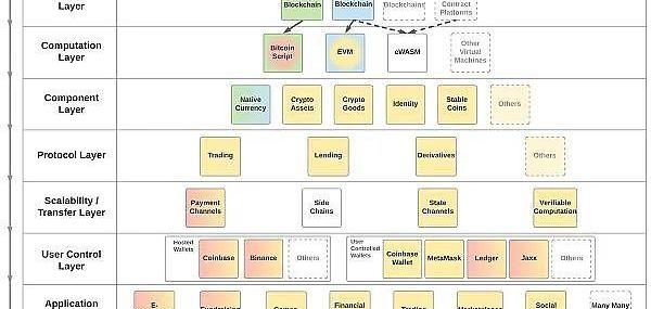 上面框架中的層從頂部開始,沿著y軸向下構建。顏色代表不同層中模塊之間的兼容性。例如,今天的加密商品,如上所示,與EVM兼容,但與比特幣腳本不兼容。反過來,EVM與以太坊區塊鏈兼容,但與比特幣區塊鏈不兼容。這使我們能夠將與比特幣腳本兼容并因此記錄在比特幣區塊鏈上的未來加密商品放入框架中。這種模塊化對于Web3.0的健壯性至關重要,因為升級其中一層不應該需要完全重寫它下面的所有內容。