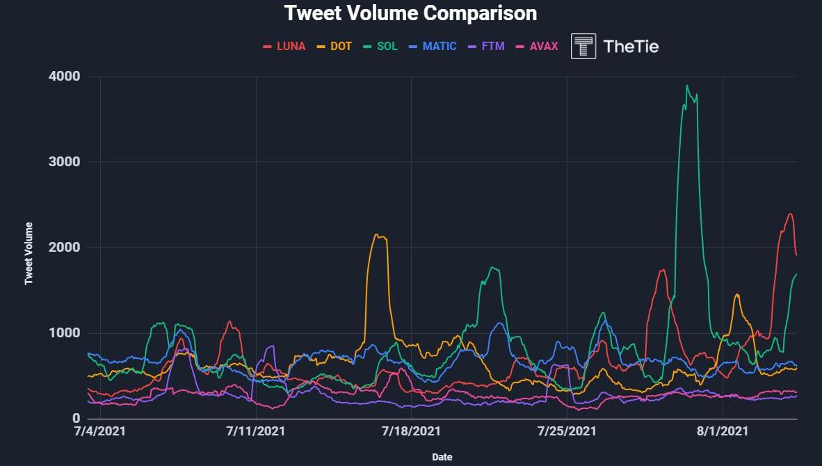 Luna的推文數量最近超過了其競爭的生態系統,僅有2000多條推文/日。