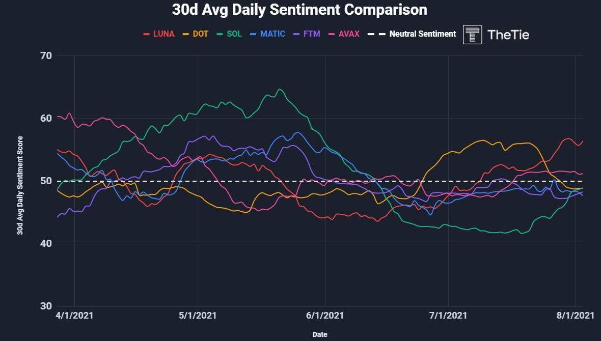 自4月1日,Luna的日均情緒30天平均值已攀升至50以上,并首次在競爭對手中處于領先地位。