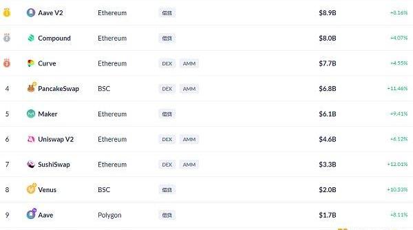DeFi項目鎖定資產前十排名及鎖倉量,數據來源:Debank