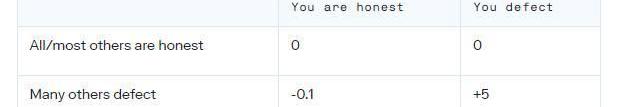 我們可以用一個回報矩陣來通俗地描述每種情況,其中「缺陷」意味著「下載并使用執行反欺詐的軟件」。報酬是「短視」的,沒有考慮到長期后果。