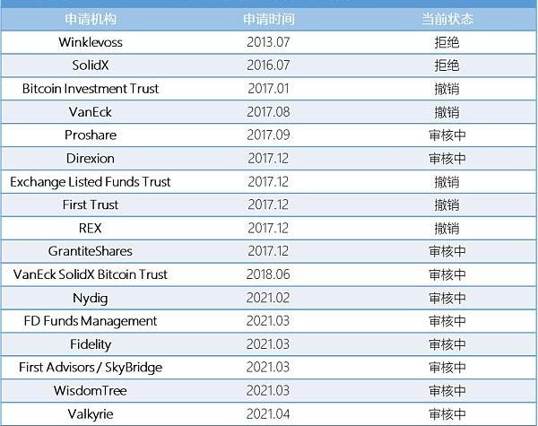 表2列出了以往各大機構向SEC提交申請成立比特幣ETF的時間和如今狀態。我們可以看到2021年3月是申請的高峰期。當時比特幣價格屢創新高,導致許多機構都爭相搶著成立第一支比特幣ETF基金。