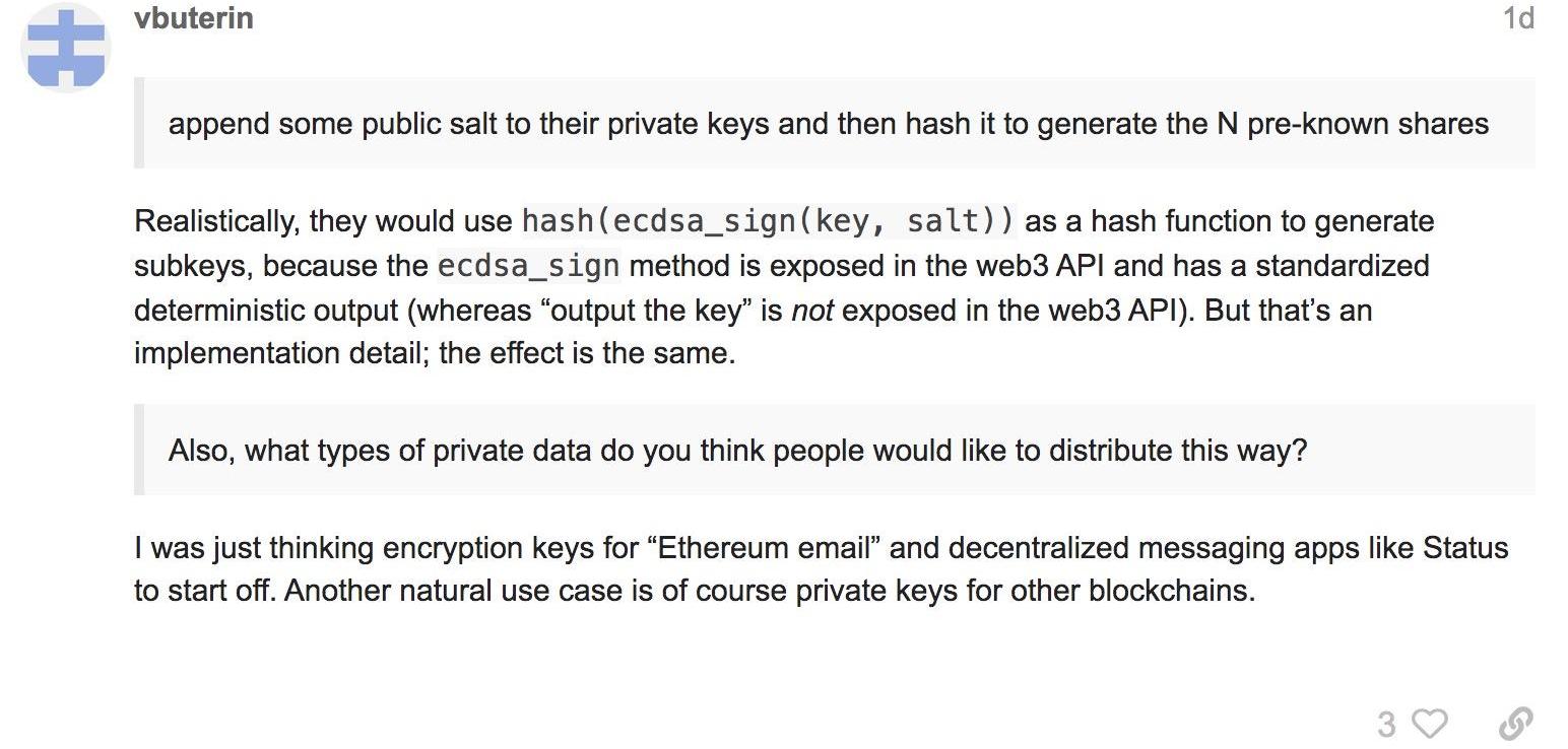 1、實際上,他們會使用hash(ecdsa_sign(key,salt))作為哈希函數來生成子密鑰,因為ecdsa_sign方法在web3API中公開并且具有標準化的確定性輸出。但這是一個實現細節,效果是一樣的。2、我只是在考慮‘以太坊電子郵件’以及像Status這樣的去中心化消息傳遞應用的加密密鑰。另一個用例當然是其他區塊鏈的私鑰。