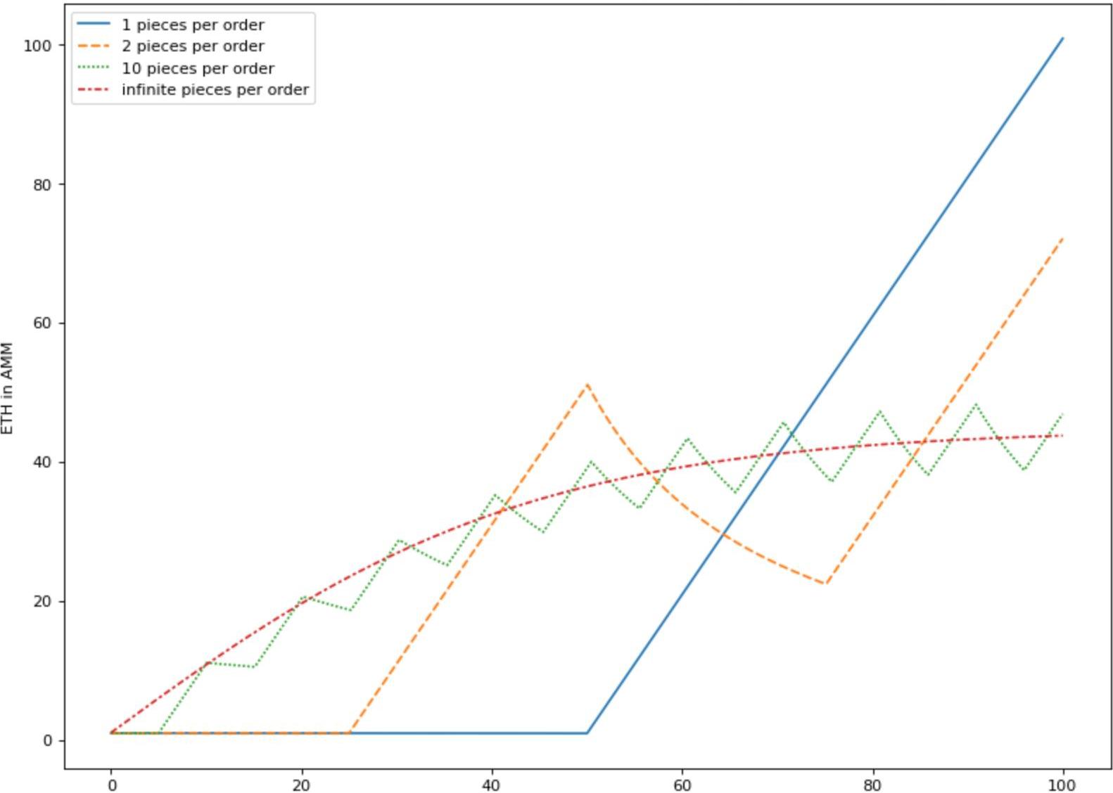 簡而言之,希望在AMM上執行大訂單的交易者不應該在單筆交易中執行:他們最好將訂單分成幾個部分。這可能涉及一次向多個AMM發送訂單,但這些AMM在任何給定時間點的流動性也有限。訂單越大,隨著時間的推移將其拆分就越有吸引力。
