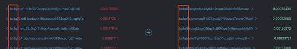 正如下圖從知帆科技Chaindigg區塊鏈瀏覽器截取的CoinJoin交易記錄顯示,在同一筆交易記錄中左邊的輸入地址有68個,輸出地址更是達到105個之多,并且兩邊的比特幣地址格式都是一樣的,只靠人工追蹤是很難重新建立輸入輸出地址的關系的。
