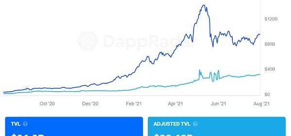 TVL指由DeFi應用程序管理的所有加密資產的美元價值。由于加密市場的波動性,TVL直接反映出的往往是價格的變動而不是DeFi資產負債表的變化。AdjustedTVL指的是調整后的TVL,該數據可以準確反映DeFi上加密資產的余額變化。