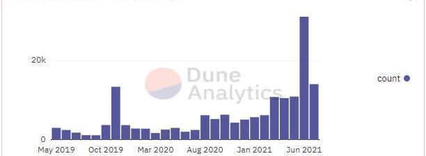 Opensea是全球最大的綜合性NFT交易平臺,涉及的NFT包括藝術、音樂、域名、體育等。同時,Opensea還提供有免gas手續費鑄造、出售NFT的服務,這一點在市場鶴立雞群。根據DuneAnalytics上的數據,2021年2月之前,Opensea上的NFT交易一直不溫不火。來到二月份,NFT市場整體交易量呈現爆炸式增長,Opensea也不例外。整個二月份,Opensea的總交易額相比一月增長了十倍以上,達到了9500萬美元以上,總交易NFT數增長了四倍,達到4萬余件,活躍用戶增長了一倍,為15000余人。隨后,伴隨著NFT市場的火爆,Opensea的熱度也始終保持在較高水平,于5月4日達到了單日交易額2300萬美元的最高紀錄。