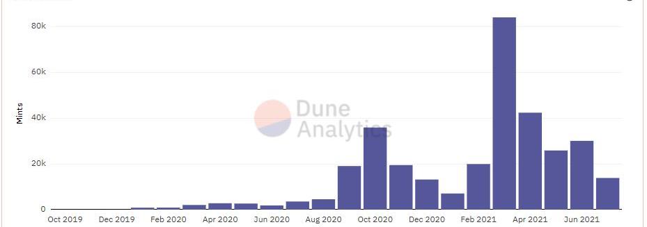 同ArtBlocks略有不同,SuperRare的定位是更加高端的藝術品市場。加入SuperRare的藝術家都需要經過嚴格篩選,高水準的藝術家和收藏家在這個平臺上可以進行交流和社交。SuperRare平臺在第一次的NFT銷售中收取行業內相對較高的15%的手續費,但由于其高藝術水準的特性這樣的收費也算合理。目前,SuperRare的總銷售額超過8100萬美元,NFT份數超過20000個。發展趨勢方面,SuperRare的熱度在2021年3月到5月到達頂峰,而近兩個月則有所遇冷。我們認為,對于一個定位高端的藝術品市場,狂熱的交易很難成為常態,而社交方面的價值才是隨著會市場沉浮一直沉淀的核心價值。