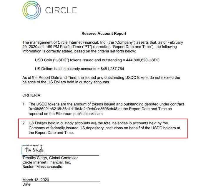 托管賬戶中僅持有美元加密市場大崩盤,Circle更改證明協議,高透明度不再透明2020年3月,CircleUSDC發布2月證明聲明。該證明聲明如下: