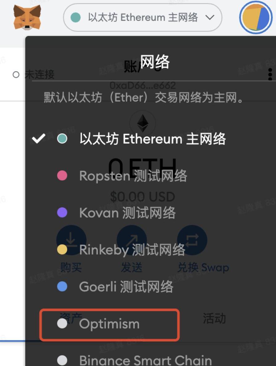 如果依然想第一時間體驗Layer2版的Uniswap,用戶需要首先在Layer1版Uniswap上連接自己的MetaMask錢包,并將錢包的網絡從以太坊主網切換到Optimistic網絡。