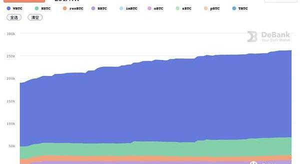 BTC錨定幣也是DeFi中少數持續增長的方向之一,發行量從185711枚增長到259747枚,增加39.9%。因為統計的是BTC的數量,與價格無關,統計結果不受價格的影響。而當前并未統計除以太坊以外的其它區塊鏈平臺,實際其它平臺也發行了較多的錨定幣,如BSC上的BTCB。