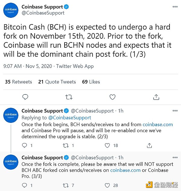 11月5日早間,Coinbase官方發推稱,比特幣現金(BCH)預計將于11月15日進行硬分叉升級。在分叉之前,Coinbase將運行BCHN節點,并預期它將成為占優勢的分叉鏈。一旦開始升級,Coinbase.com和Coinbase Pro將暫停BCH發送和接收服務,待確定升級穩定后重新啟用。官方提醒稱,一旦硬分叉完成,Coinbase.com和Coinbase Pro將不支持BCH ABC分叉幣的發送和接收。