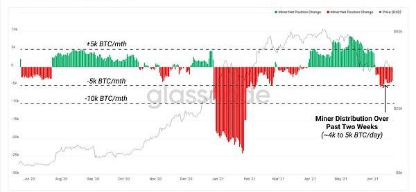礦工持倉凈額變化指標顯示了礦工未使用的供應30天的變化率。這表明在過去的兩周里,分發量明顯增加,通常與哈希率的整體下降相吻合。在過去的兩周里,礦工們以每月約4千到5千的速度凈分發。這已經扭轉了自4月以來凈積累的趨勢。