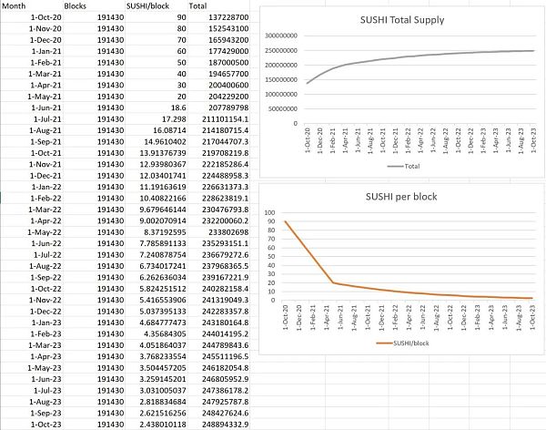 Sushi價格經歷了非常夸張的降幅,作為單挑Uniswap這只獨角獸的騎士,Uniswap一度因為過量的增發、創始人事件而經歷了很多陣痛,但是而Sushi社區快速作出了反思的,通過公開選舉而選出了9名多簽成員,并且建立了核心團隊,修改了代幣模型,是將Sushi的總量固定為2.5億個,目前流通量約1.52億,從原來每區塊獎勵1000個到現在每個區塊獎勵80Sushi,未來還會遞減,并且其中2/3會進行鎖定。每天釋放量約433333,扣除鎖倉后真實釋放量約144444,按照1.2 usd/Sushi價格計算,每天產生17.3萬美金供給量,而UNI每天則產生128萬美金的供給量。并且Sushi建立了回購機制,回購了約170萬美元的Sushi。可以說Sushi的代幣模型通過市場下跌的不斷磨合,已經產生了新的供需關系。