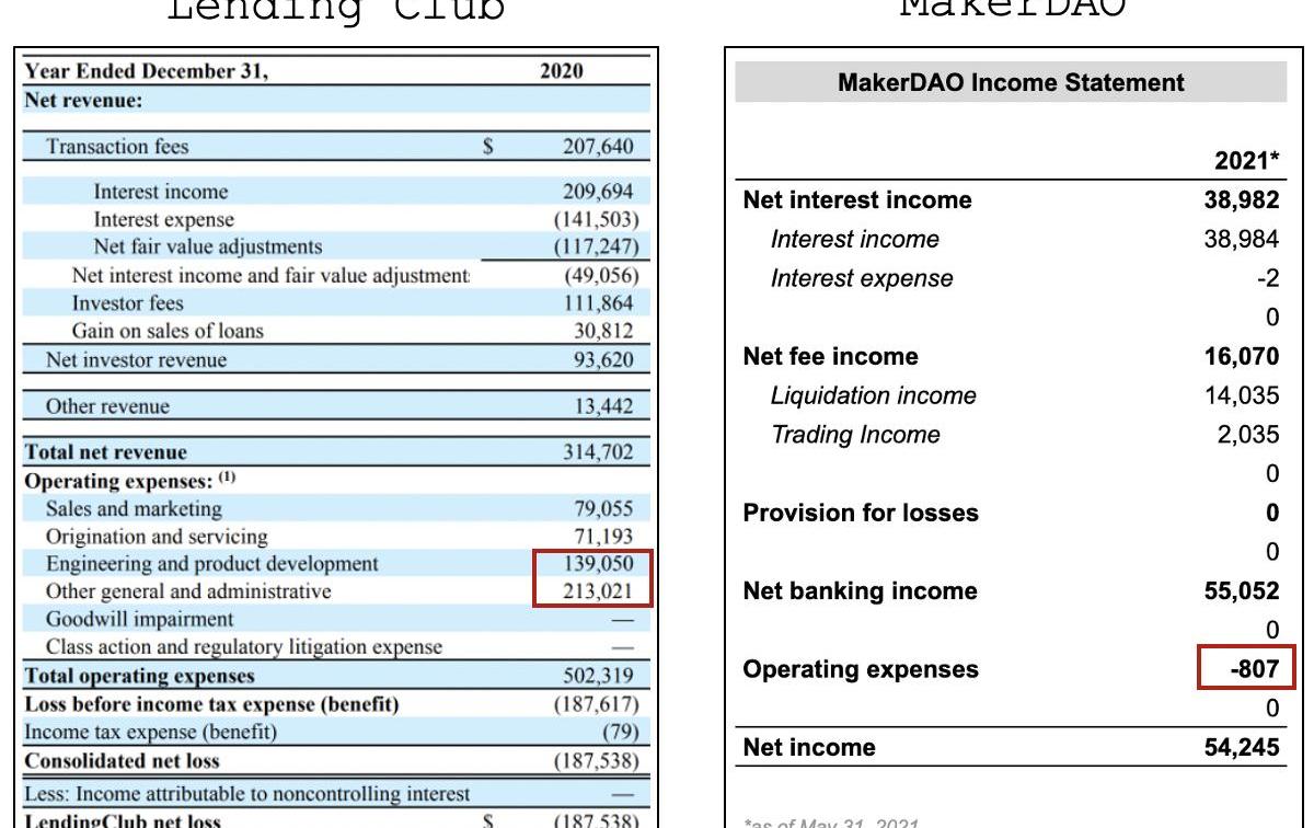 沒有什么是完全對等的,但讓我們用一組關系最密切的三個收入報表的例子來盡所能地進行比較:德意志銀行、LendingClub和MakerDAO。