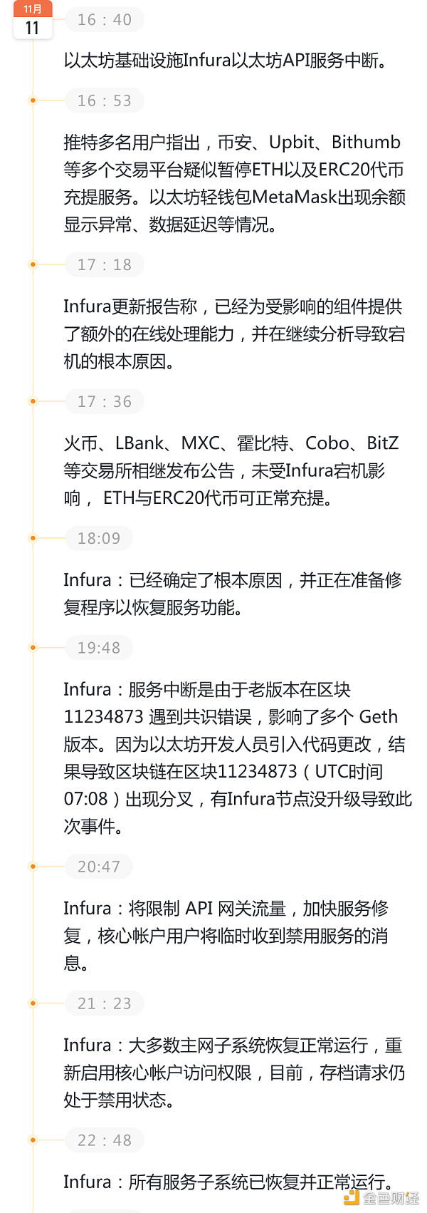 XRP/HKD-5.25%11月11日下午,Infura以太坊API服務中斷。Infura表示,此次事件根本原因可追溯到基礎架構中的多個組件,這些組件鎖定到 go-ethereum 客戶端老版本,該版本在區塊 11234873 遇到嚴重的共識錯誤。從而導致使用Infura服務的錢包、交易所或者其他工具出現了與以太坊連接不暢的情況。目前,所有服務子系統都已恢復并恢復正常運行。金色財經收集整理了此次事件主要時間節點,供你了解事件全過程。