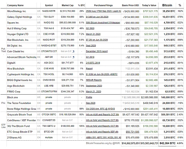 根據bitcointreasuries.org的數據,迄今為止,全球共有23家公司公開持有總計84萬枚比特幣,約占比特幣總量的4%。