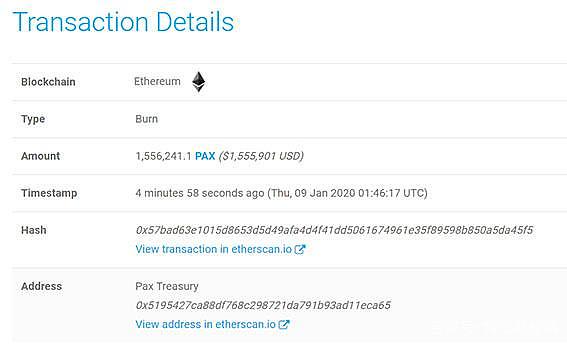 就在上個月,PAX就有過兩次銷毀:2019年12月5日17:32,以太坊鏈569萬枚PAX被銷毀,按當前價格計算,價值約570萬美元;12月26日9:19:09,以太坊鏈上1,355,248枚PAX被銷毀,按當前價格計算,價值約136萬美元。