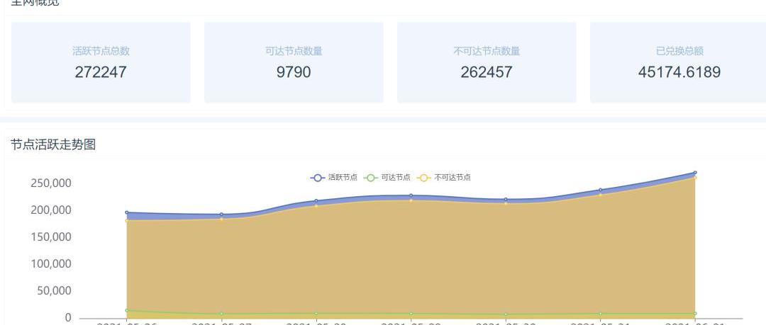 Swarm當前處于測試網尾期,由于測試網有100萬個BZZ空投獎勵,吸引到眾多礦工參與。截止目前Swarm測試活躍節點數超過27萬個,節點在全球廣泛分布。測試網礦工創建節點后獲得不同分值的支票,主網階段可以用于兌換BZZ。主網上線時間不確定。