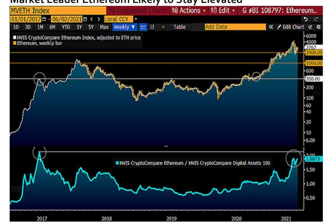我們認為,4萬美元左右可能是加密牛市休息期的價格上限。排名第二的以太坊正在迅速邁向市值第一的位置,并且一直是2021年彭博銀河加密指數的主要推動力。比特幣更有可能突破阻力上漲至100,000美元,而不是跌入20,000美元以下。