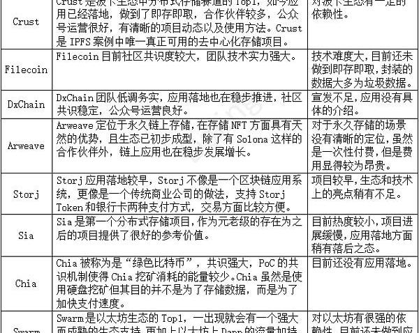 綜合而言,各個項目都在為了生態的發展進行著一波又一波的技術更新,并且在分布式存儲賽道中的作用各不相同,Crust目前主要致力于解決三個層次化、模塊化的問題,可以提煉為三個關鍵字:報告、打包和服務。Filecoin致力于為大企業提供存儲服務,DxChain旨在設計一個可以解決去中心化環境中大數據計算問題的平臺,Arweave致力于提供數據的永久存儲,Storj旨在提供可供商業級應用落地使用的方式,Sia為整個分布式存儲賽道的發展奠定了一定的基礎,后期出現的Chia與Swarm更是值得期待。