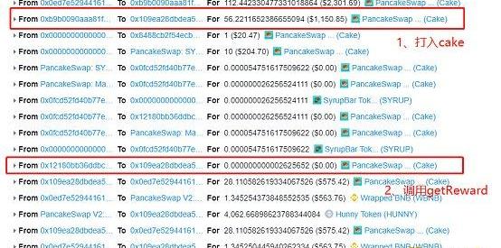 黑客首先向hunnyMinter合約中打入了56個cake代幣;再同時調用CakeFilpValut合約中的getReward函數,間接觸發了hunnyMinter中的mintFor函數。