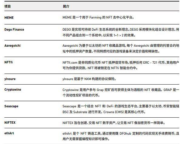 目前,NFT同?DeFi結合型應用約可分為以下幾類:一類為DeFi模式引入NFT概念的應用如?MEME、Avegotchi,一類為抵押NFT進行DeFi挖礦的WHALR、CARGO,以及直接于NFT平臺引入流動性挖礦的Rarible。