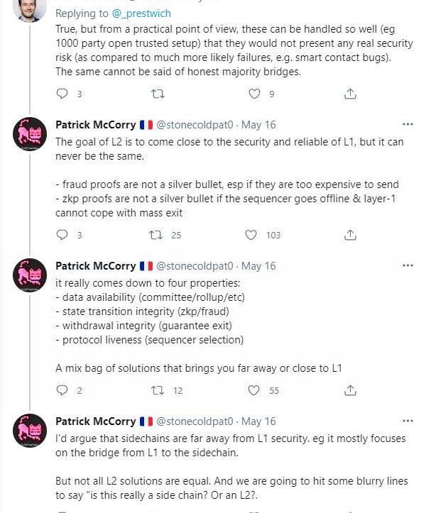 5月16日,以太坊擴容解決方案Polygon的市值躋身加密貨幣市值前20,隨后StarkWare的聯合創始人UriKolodny轉推祝賀,但同時他強調:“Polygon是側鏈,而不是Layer-2。L2的安全性依賴于以太坊;而側鏈的安全性與以太坊的不相關(甚至更低)。”因此,社區圍繞Polygon到底是不是L2開始了激烈的討論。