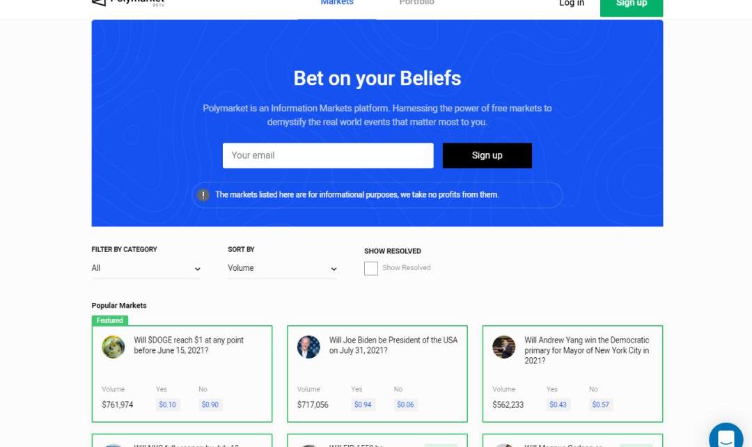 Polymarket是搭建在Polygon上的預測平臺,任何人都可在該平臺上通過穩定幣USDC針對有爭議性的話題進行下注。